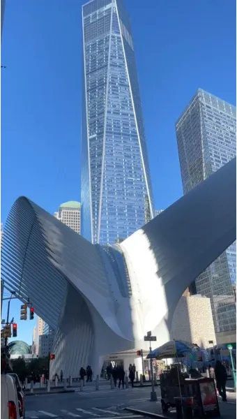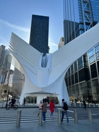 포토 포인트: 트리니티 처치 앞 길목의 수직 퍼스펙티브, 뉴욕증권거래소 국기, 배터리파크의 리버사이드 벤치, 오큘러스 내부 곡선 구조.